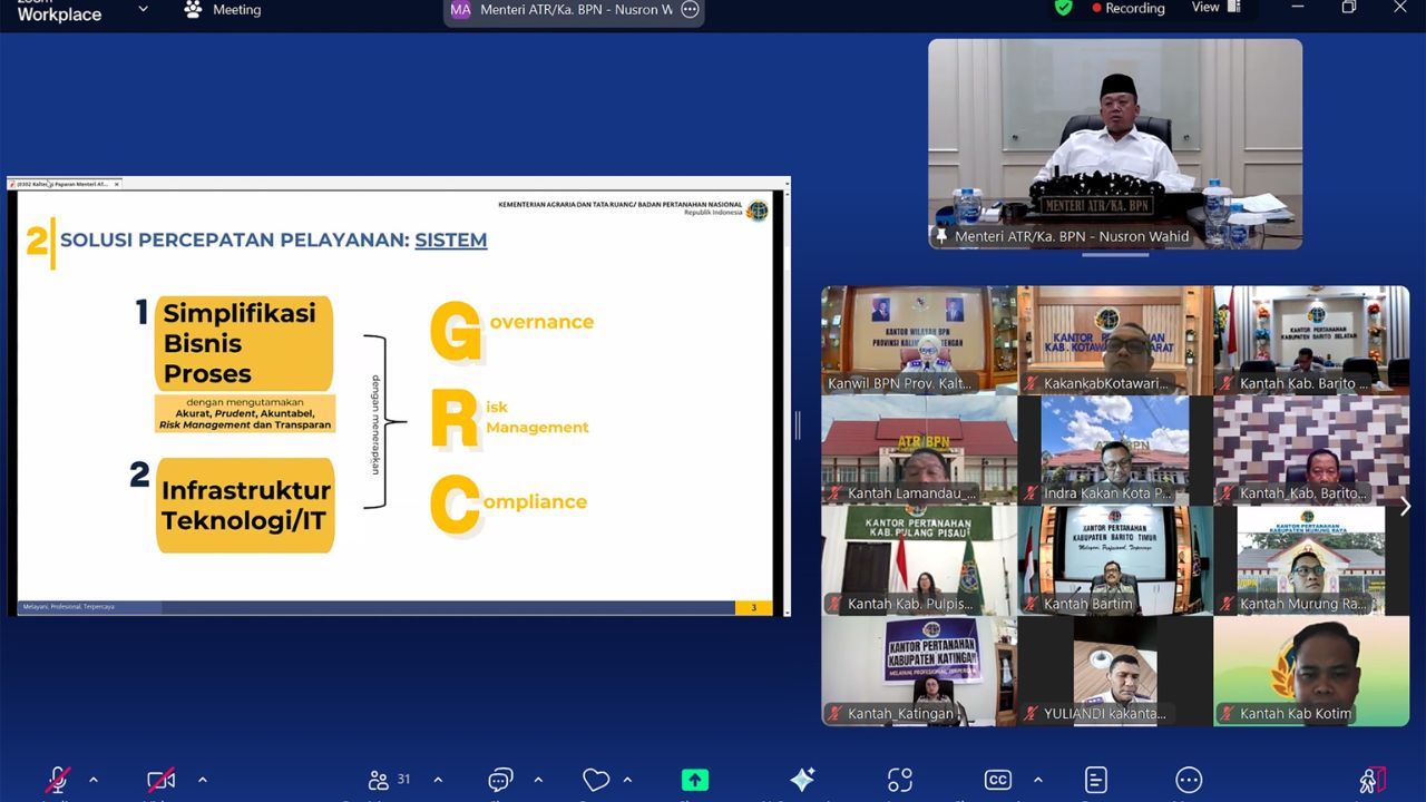 Turut hadir secara daring, Wakil Menteri ATR/Wakil Kepala BPN, Ossy Dermawan; Direktur Jenderal Pengendalian dan Penertiban Tanah dan Ruang, Jonahar; dan Staf Khusus Bidang Reforma Agraria, Rezka Oktoberia. Turut hadir seluruh Kepala Kantor Pertanahan Kota/Kabupaten di lingkungan Kanwil BPN Provinsi Kalimantan Tengah beserta jajaran. (GE/JR)