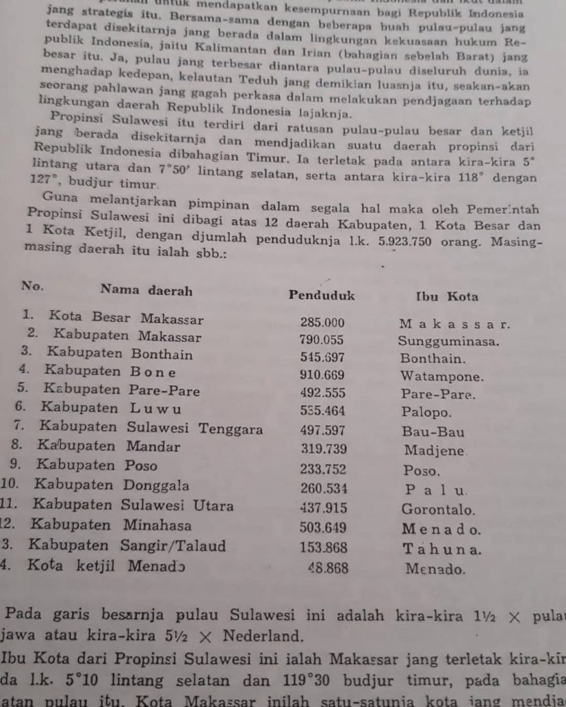 Pada masa itu, wilayah administratif Sulawesi terbagi menjadi 12 kabupaten, 1 kota besar, dan 1 kota kecil. Jumlah penduduknya mencapai 5.923.750 jiwa. Berikut Daftar Daerah dengan jumlah penduduknya sebagai berikut :