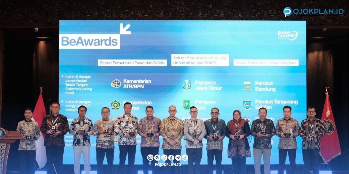 Jakarta – Kementerian Agraria dan Tata Ruang/Badan Pertanahan Nasional (ATR/BPN) meraih penghargaan dalam ajang Be Award untuk “Instansi dengan Pemanfaatan Tanda Tangan Elektronik Paling Masif” Kategori Sektor Pemerintah Pusat dan BUMN, Kamis (20/11/2025), di Gedung Sasono Langen Budoyo, Taman Mini Indonesia Indah (TMII), Jakarta. Be Award sendiri merupakan bagian dari acara Digital Trust 360 Summit yang diselenggarakan oleh Badan Siber Sandi Negara Republik Indonesia (BSSN RI).